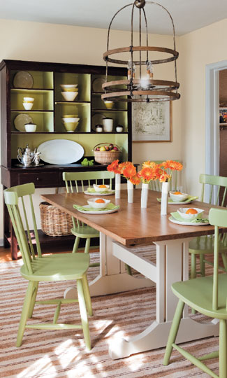 While the dining room acted as the cottage’s main conduit (it has a window, a door, a hallway opening and a second-floor staircase), it had no real connection to the rest of the rooms. “The floor plan was almost predetermined. It was more about relating to the kitchen, changing colors and adding timeless elements,” says the designer. Case in point: Shaker-style dining chairs and the interior of the preexisting hutch-cum-practical buffet are pear-green to echo the kitchen’s verdant ceiling.