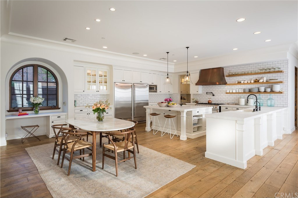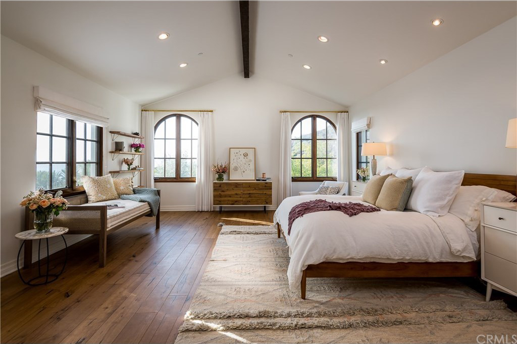 The Spanish-style home is situated on 1.42 acres of manicured lawns in the guard-gated Enclave community of Pacific Palisades. Inside, it features a breezy open floor plan and 5 en-suite bedrooms as well as his-and-hers offices on the first and second floors. An avid cook and entertainer, Conrad paid special attention to the kitchen, where a sprawling island is topped with Mystery White marble countertops—a decision that she told MyDomaine was a must considering Mystery White’s stain resistance—and a La Cornue range anchors the space with a touch of glam. The party continues in the outdoor entertaining space, which features 2 patio areas, a built-in BBQ, an outdoor fireplace and a pool with a waterfall.