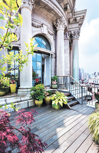 Originally the penthouse measured 3,000 square feet, spread out over three floors. But with the discovery of an extra room above the dome and the purchase of an adjoining apartment, the home grew to a massive 6,000 square feet—not including the 2,000 square feet from four terraces that encircle the dome. Dubbed the clock tower room, the newly annexed 40-foot-wide circular space had not been used for more than a century and was previously accessible only to clock mechanics, who periodically showed up to make sure that the massive ticker was keeping accurate time. “The clock still works,” says Bagley, “so every 60 seconds you can hear the minute hand making its move. The kids love it.” Still retaining its original brick walls, the space now acts as a casual family crash pad, complete with a grand piano for impromptu recitals.
