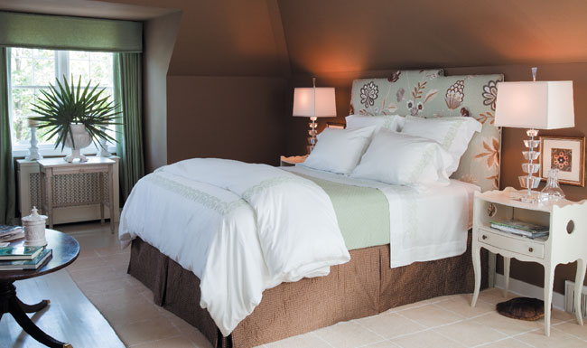 Since it was nearly a blank slate—save for a queen bed, two end tables and a lone mattress within the alcove—they easily developed a plan. “We aimed for hotel-suite sophistication,” says Moralee. A sofa and coffee table form a place to chat, while the alcove’s arched window perfectly frames a desirable workspace. “And because the room has masses of natural light, rich brown looks so beautiful and elegant on the walls,” adds Denham. To unify the cottage’s second level (stairway included) the designers painted the entire floor a soft, creamy beige.