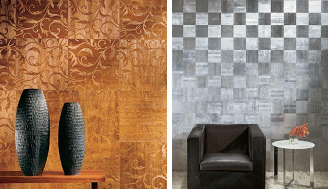 left to right: Maya Romanoff’s wood weave Ajiro Marquetry pattern; The shimmery surface of Maya Romanoff’s “Metals Basketweave”