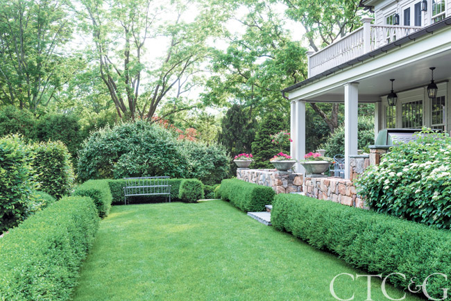 Chris Kusske’s vision for Turkey Hill was to give the Bergs room to breath while imposing a little more structure overall. Perennial beds next to the house were replaced with quiet green terraces bordered by boxwoods. (The plants were replanted in a lower plot at Turkey Hill, and divisions are donated annually to the Westport Garden Club plant sale.)