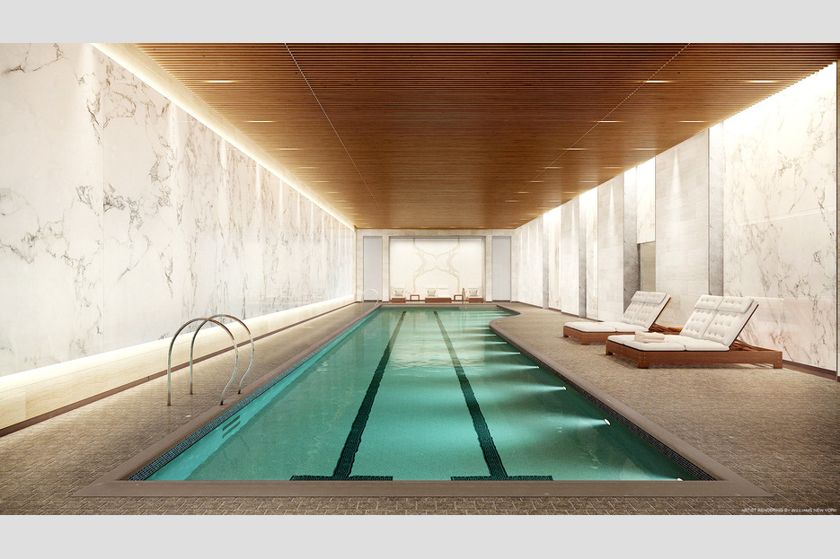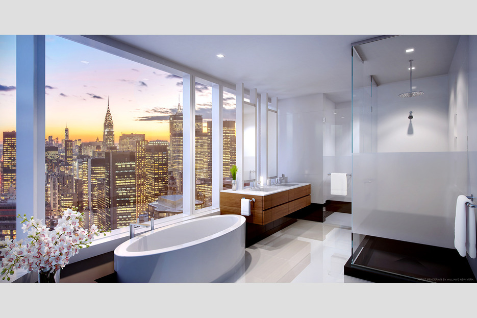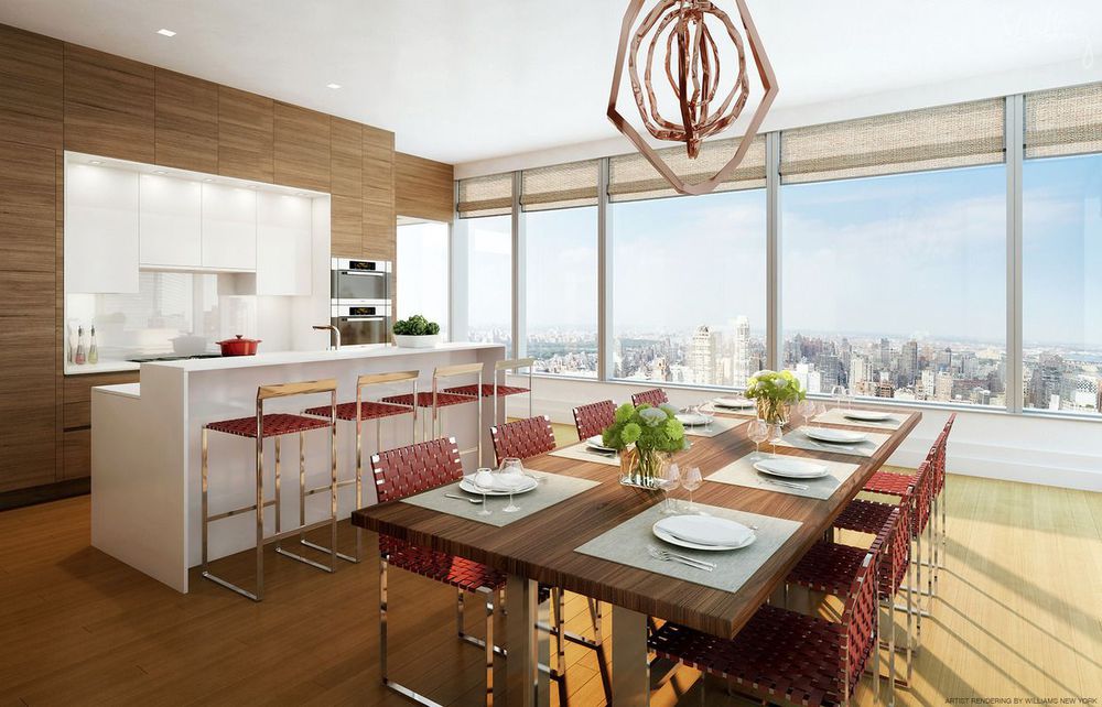 The luxury condominium was developed by World Wide Group and Rose Associates and includes a roster of enviable amenities including towering 12’6 ceilings, a dramatic curved glass wall and 100-bottle wine refrigerator.