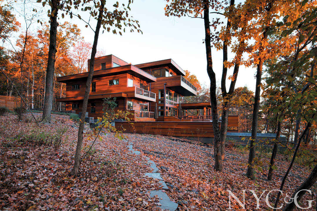 It’s a common goal: A New York City couple wants their weekend home to serve as a tranquil retreat. For this Saugerties residence, Foz Design chose a palette that included wood and locally quarried stone, referencing mid-20th-century modernism while making a distinctive architectural statement. A guest wing contains four bedrooms and remains linked to, but independent of, the house via a glassed-in hallway. Judge Tara Seawright says that the home’s “warm wood exteriors evoke Frank Lloyd Wright’s Fallingwater, creating a relaxing first impression.”