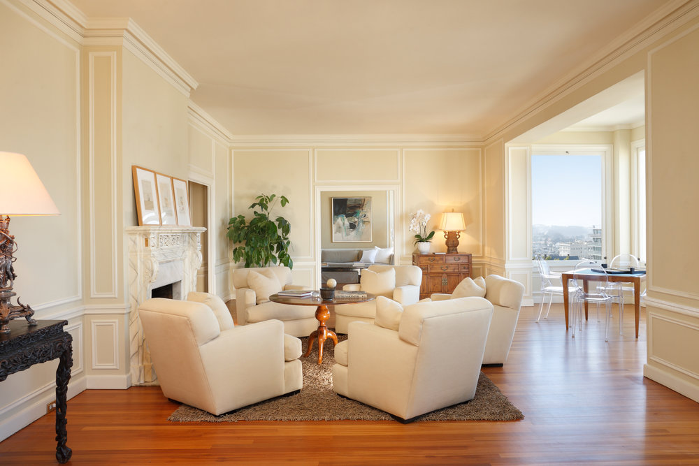 A relative rarity, this full-floor penthouse in Pac Heights combines traditional architectural detailing with expansive Bay and city views. Located atop 1940 Broadway—a 1920s, 10-story co-op building— the 3-bedroom apartment has elegant moldings and fireplaces in the living room and library. On the market for the first time in 25 years, it is offered for $8.2 million by Joseph Lucier of Sotheby’s.
