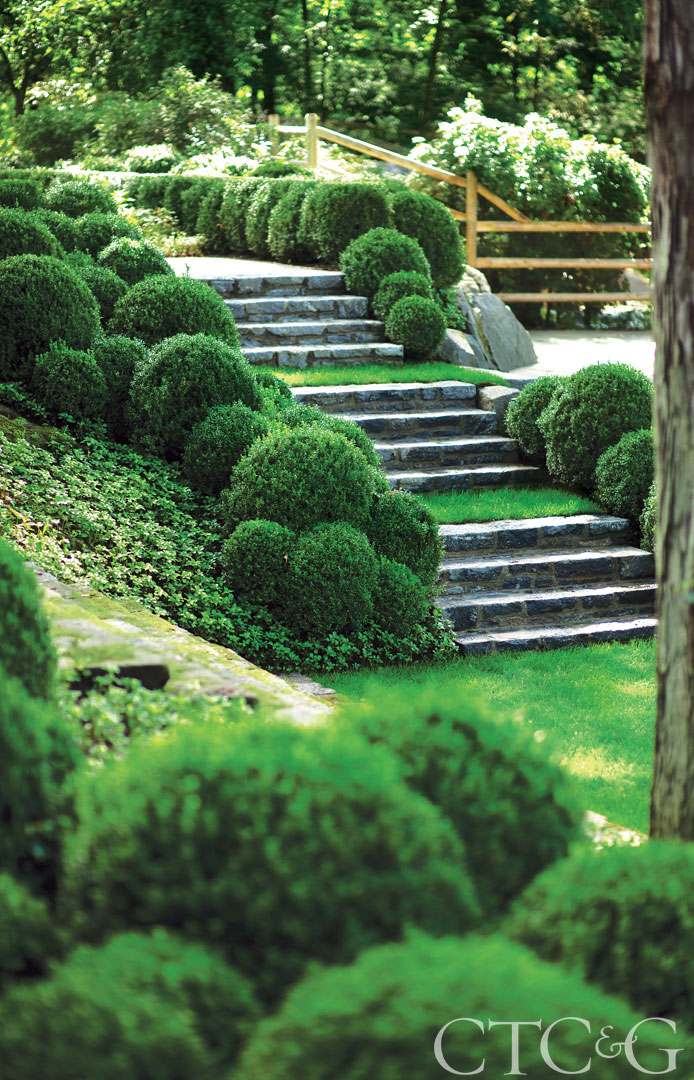 Together, Doyle and Brown developed a sympathetic landscape of tonal, muted harmonies. “We structured the landscape in an organic, natural way,” Brown explains. “The pathways were completely redone, and we inserted broad flights of steps to connect the terraces. The only thing ‘grand’ here is the stairway we added at the back of the house.” The stairs’ steps are made of Barram Black, a locally found granite.