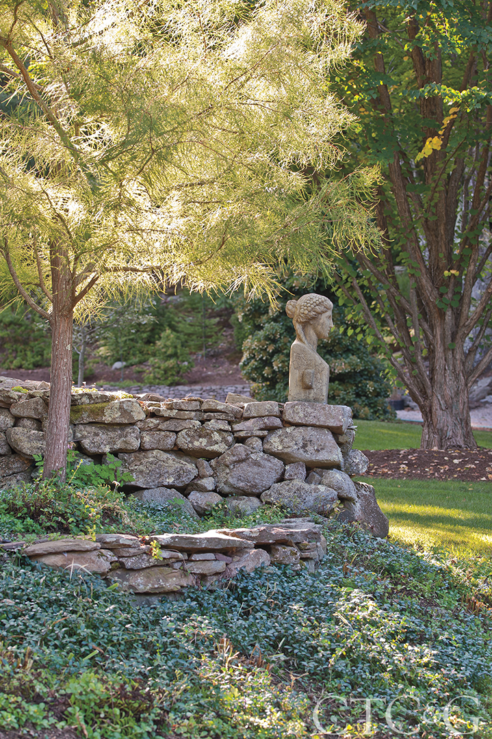 Similarly, stewartias form their camellia-like white blossoms in the heat of season. Although perennials are not big on his want list, he carpets areas with low-maintenance groundcovers such as sedum. Plus he travels around, hunting up woody wonders to add to the exhibition.