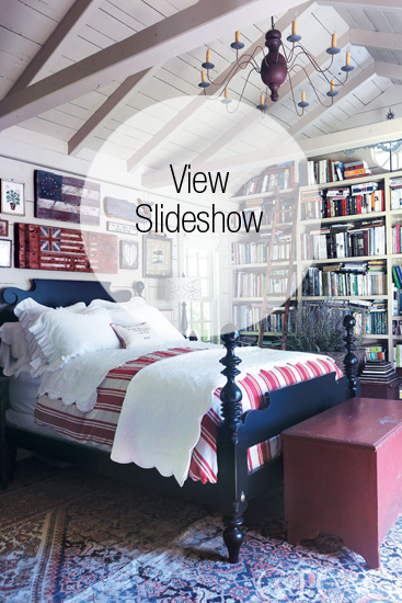 A Google search for “dismantled antique buildings” led to a business that takes down old barns, which in turn led to an 1857 chicken coop and its original brick foundation being transported on two trailers with a state trooper escort to its new home. Somehow Murphy saw past the blown-out windows and lack of a floor to envision a white-paneled room with a cathedral ceiling and built-in bookcases, plus space that could handily accommodate a bed of any size.